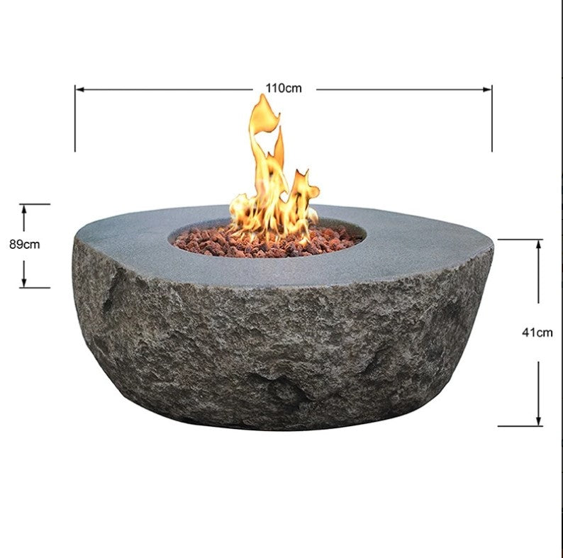 The Elementi Boulder Gas Fire Pit Table is constructed with high-performance cast concrete and designed to resemble a natural boulder.