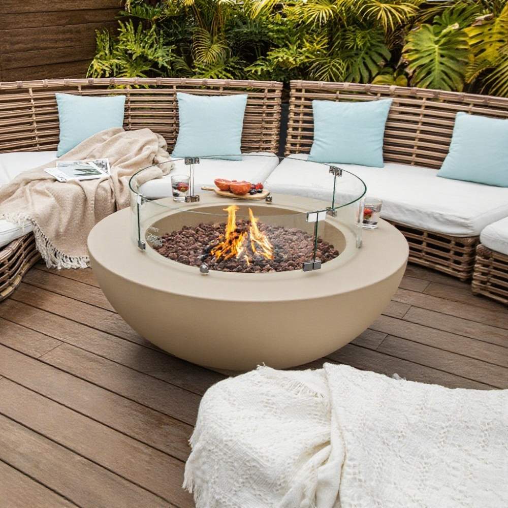 The Lunar Grey Fire Bowl Table, with its modern, clean lines and natural grey or beige/cream finish, is the perfect addition to your garden or patio.